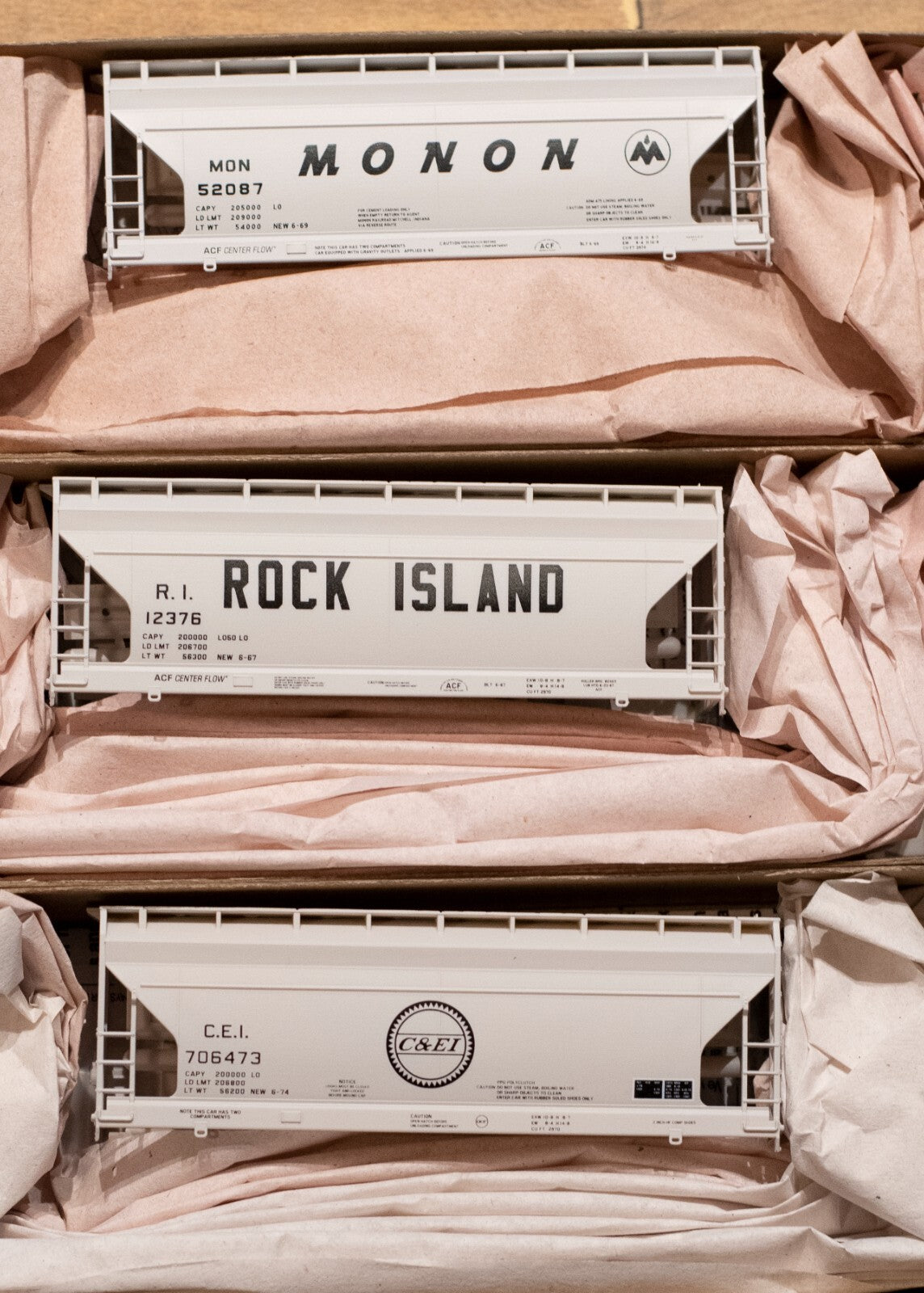ACF 2-Bay Covered Hopper 3-Pack - Kit -- 1 Each: Monon #52087, Rock Island #12376, Chicago & Eastern Illinois #70647