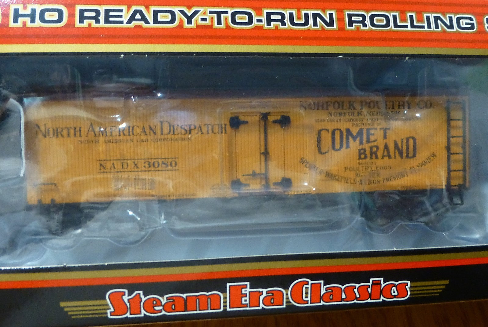 New in Package Atlas HO Scale #20002709 36' Wood Reefer w/Truss Rods - Ready to Run - Master(R) -- Norfolk Poultry Company NADX #3080 (yellow, Boxcar Red)