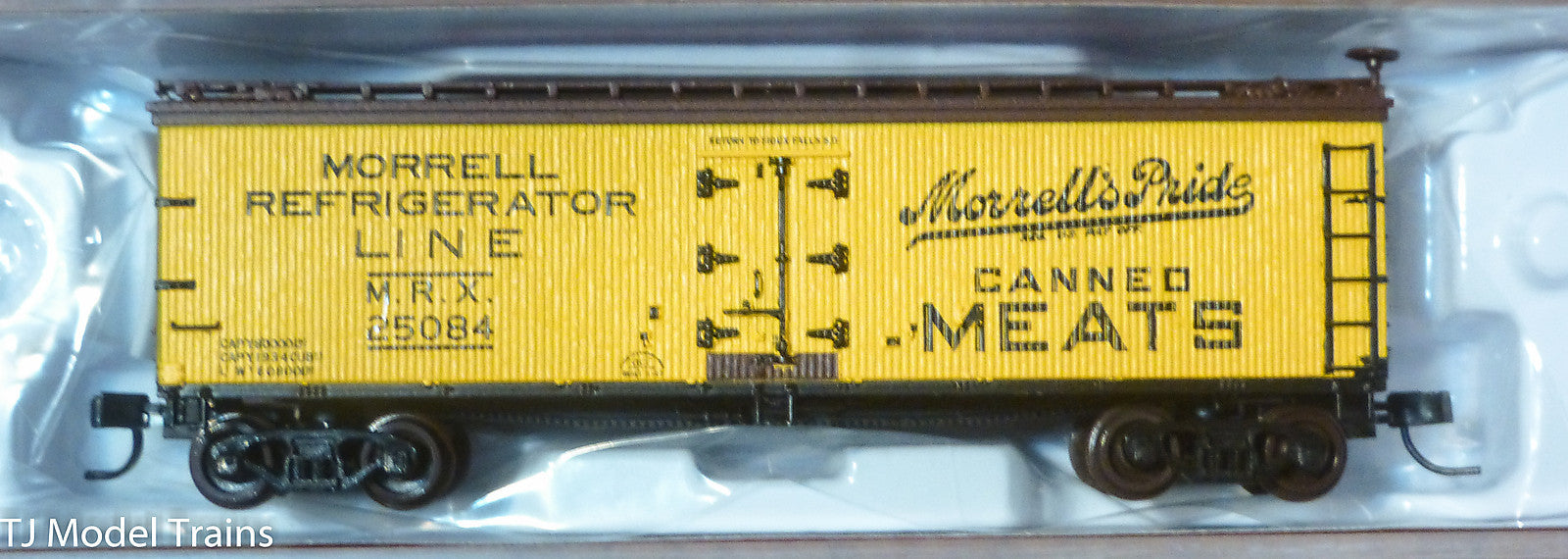 Atlas N Scale / 40' Wood Reefer - Ready to Run -- Morrell Refrigerator Line #25084 (yellow, black, Boxcar red, Canned Meats)