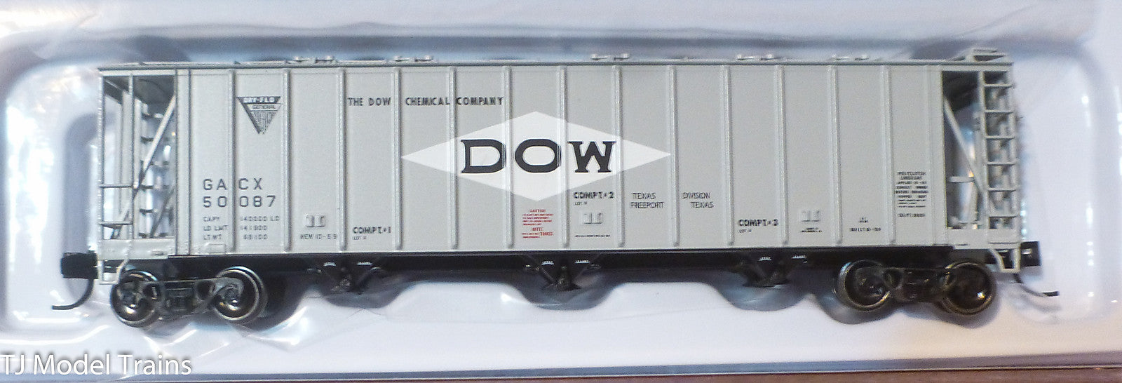 Atlas N Scale / General American 3500 Dry-Flo 3-Bay Covered Hopper - Ready to Run -- Dow Chemical Co. #50087 (gray, white, black)