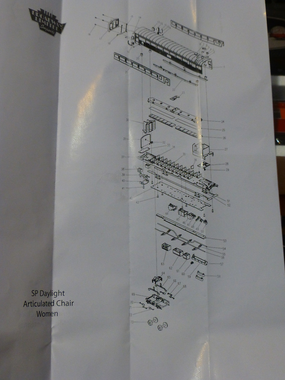 Broadway Limited: HO Scale #1579 SP Coast Daylight Train #98 Articulated Chair Car -- Southern Pacific #W2460/#M2459 These models are based on the post-war version of the train with unskirted bodies and Southern Pacific lettering.