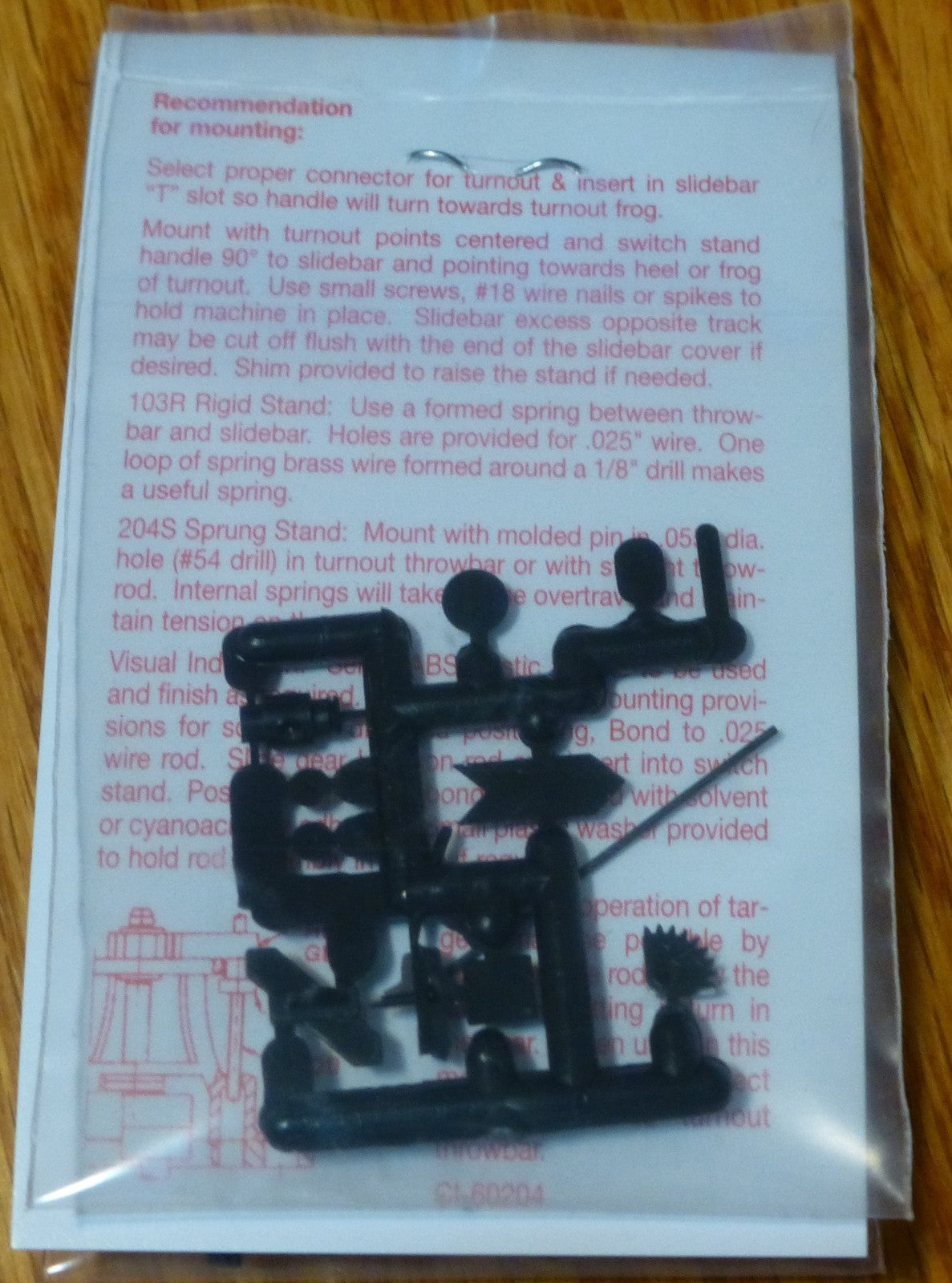 Operating high level switch stand is based on prototypes used by many roads. Working parts are Delrin. Also includes six targets, nonworking lantern and square diamond made of ABS plastic. Manual target can be adapted to work from an electric switch machine (sold separately) below the benchwork. .190" travel. Kits now include a shim to raise the stand to tie level, along with five different fittings for use with most turnouts, including Atlas, Roco, Peco, Micro Engineering and Shinohara.