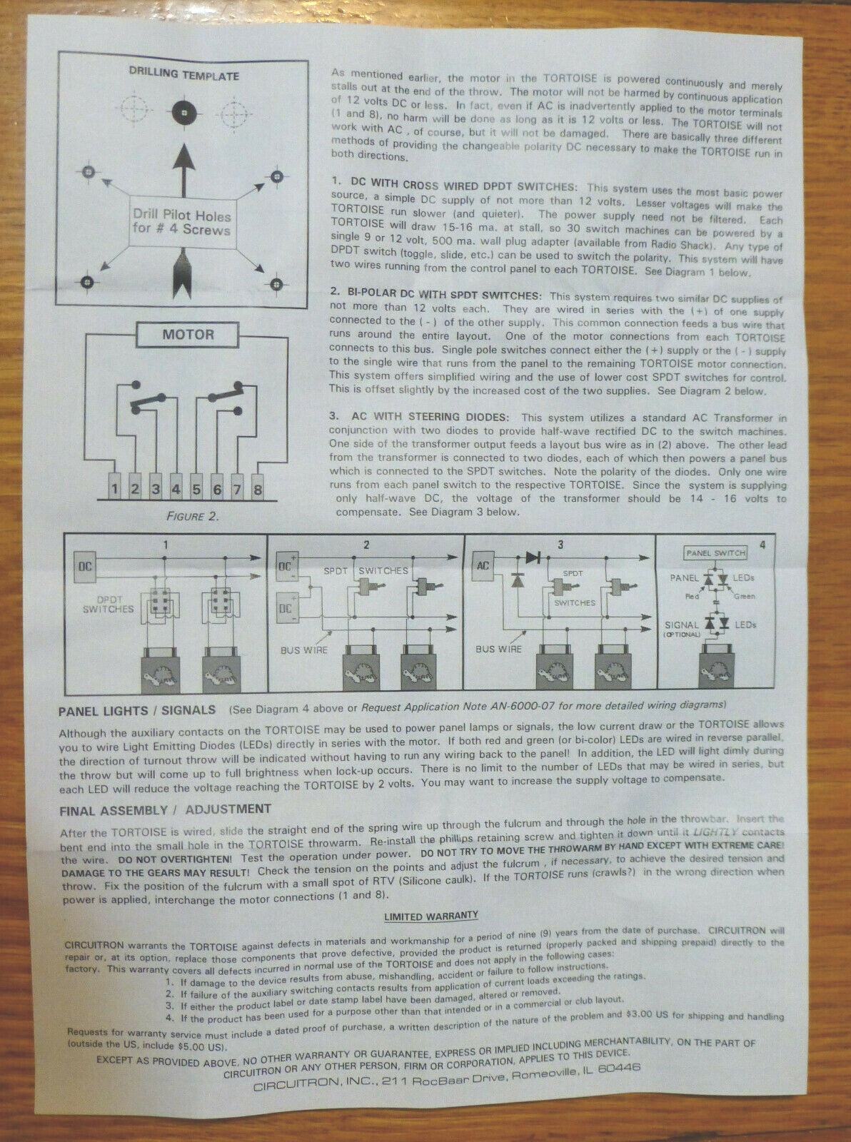 Tortoise 1 #800-6000 Prototype turnouts don't snap open and closed, they move slowly. This easy-to-mount switch machine features prototypical slow-motion action-three seconds to complete throw. Easy-to-mount slow-motion switch machine features: * Prototypical slow-motion action - three seconds to complete throw * Precision-engineered gear drive mechanism * Simple mounting with linkage included - no additional brackets or linkage necessary * Convenient auxilliary contacts - two sets SPDT provided * Easy wiring - two-wire connection possible We Combine Shipping: Thank you for shopping with TJ Model Trains, we will combine your multiple purchases. Please wait to make payment until you receive a combined invoice from us. ( Just commit to buy on all items you are needing, and then wait for the combined shipping invoice, please do not pay for items separately ) Invoices are sent once a day. We do NOT demand immediate payment as some sellers do, so you may receive multiple invoices (just pay from the invoice received after your last purchase) payment should be made within 5 days of initial purchase. TJ Model Trains |