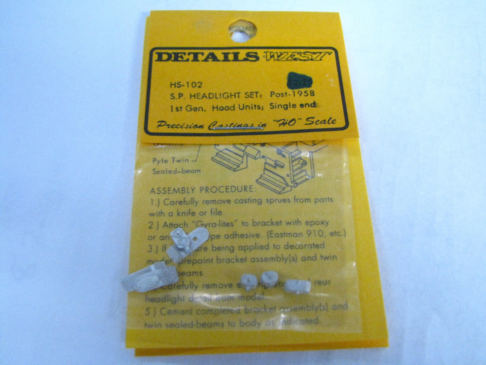 This is a new in package Details West HO Scale #102 Single End/Headlight Sets - SP - Pyle Lights, Post-1958 Hood Units HO scale (1:87) detail parts for models Thank you for shopping T-J Model Trains!! Teresa Prantle |