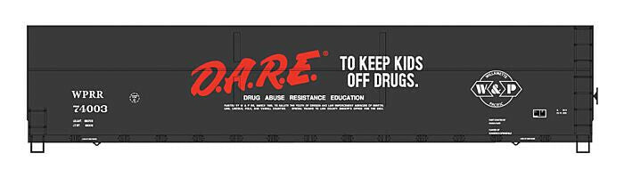 FMC Welded-Side Wood Chip Gondola - Ready to Run - Value Line -- Willamette & Pacific #74003 (D.A.R.E. Scheme, black, red, white)