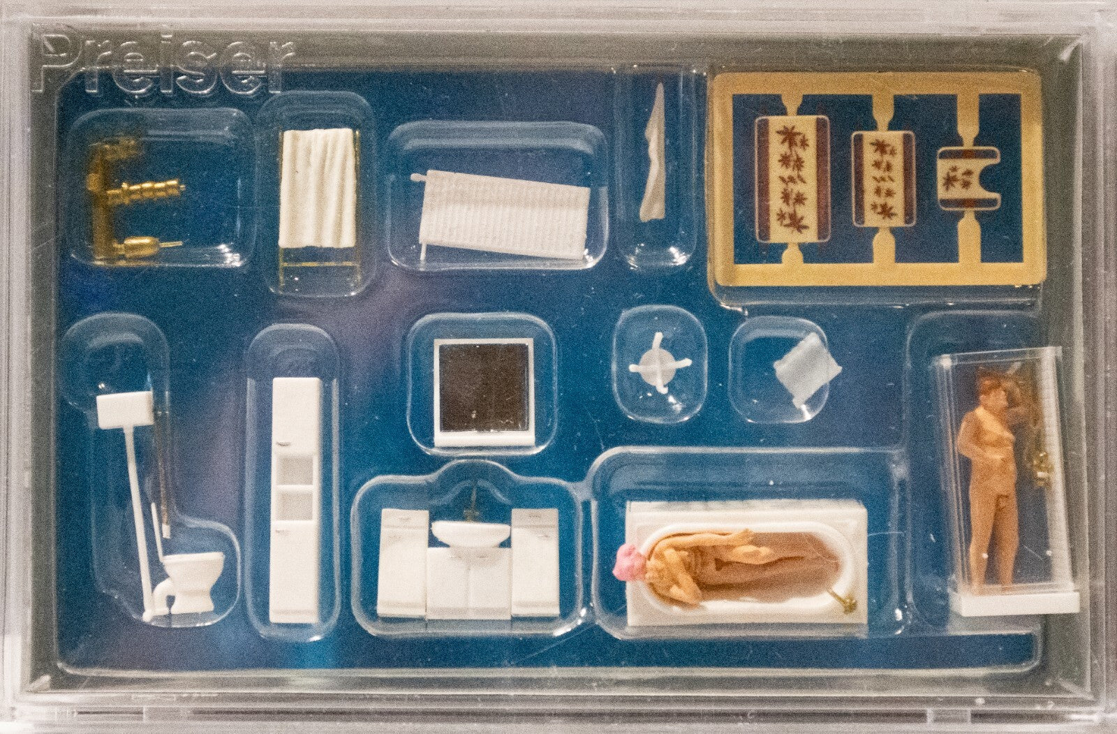 This is a new box of Preiser HO Scale #10631 1:87th scale Couple in the Bathroom -- 2 Nude Figures & Bathroom Details