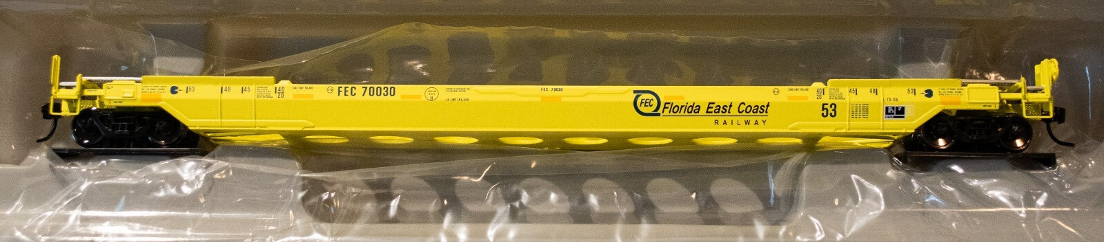 Gunderson Rebuilt All-Purpose 53' Well Car - Ready to Run -- Florida East Coast #70030 (yellow, Hurricane Logo)